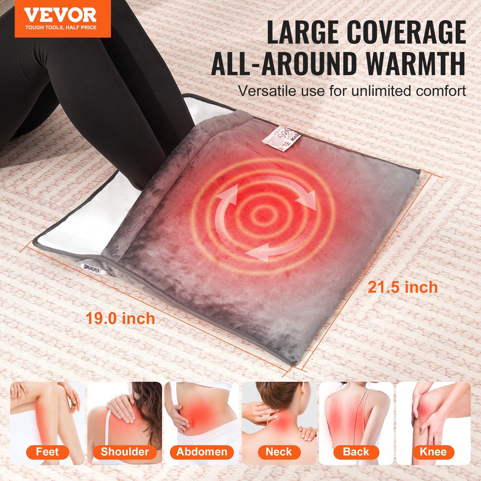 1.Lock in Warmth: VEVOR 21.5" x 19.0" large foot warmer is not just suitable for your feet - it also can provide comfy warmth for shoulders, abdomen, back, waist and knees. Enjoy fast heating, consistent warmth and comfort whether at home or in the office