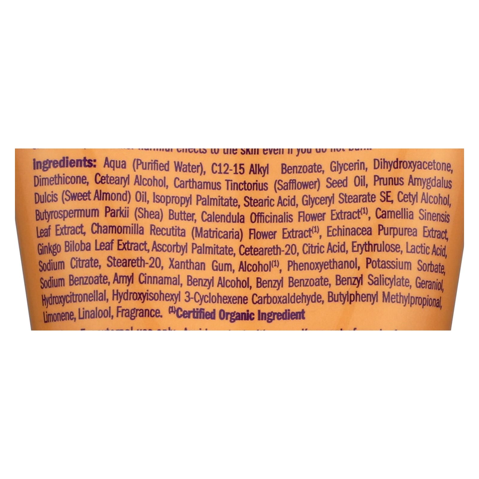 ingredients : aqua;purified water;c12-15 alkyl benzoate;glycerin;dihydroxyacetone;dimethicone;cetearyl alcohol;carthamus tinctorius;safflower;seed oil;prunus amygdalus dulcis;sweet almond;oil;isopropyl palmitate;stearic acid;glyceryl stearate se;cetyl alcohol;butyrospermum parkii;shea;butter;calendula officinalis flower extract¹;camellia sinensis leaf extract;chamomilla recutita;matricaria;flower extract¹;echinacea purpurea extract;ginkgo biloba leaf extract;ascorbyl palmitate;ceteareth-20;citric acid;erythru