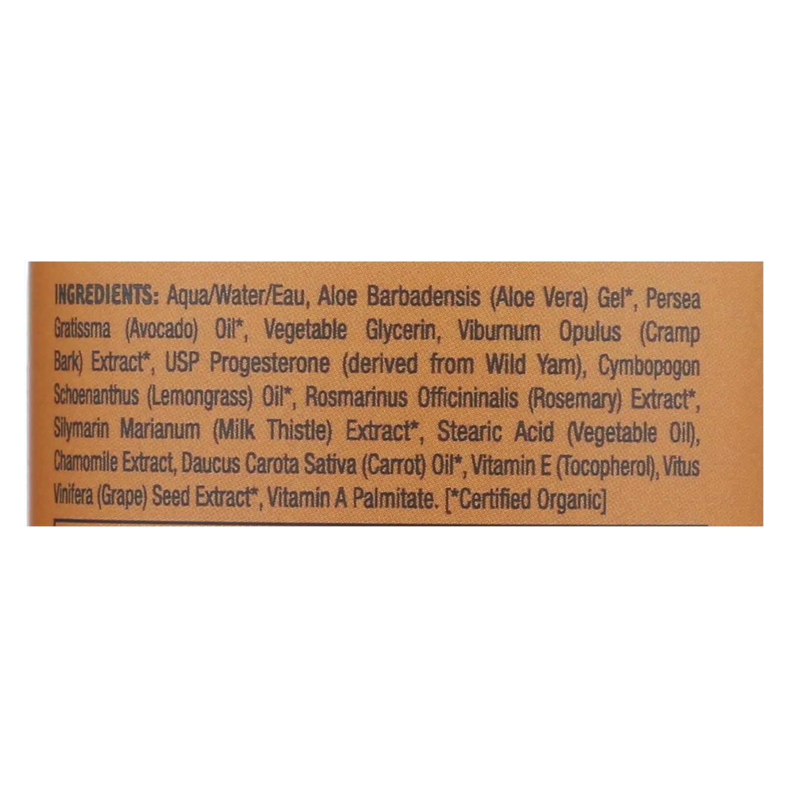 ingredients : aqua/water/eau;aloe barbadensis;aloe vera;gel;persea gratissima;avocado;oil;vegetable glycerin;viburnum opulus;cramp bark;extract;usp progesterone;derived from wild yam;cymbopogon schoenanthus;lemongrass;rosmarinus officinalis;rosemary;silymarin marianum;milk thistle;stearic acid;vegetable oil;chamomile extract;daucus carota sativa;carrot;vitamin e;tocopherol;vitus vinifera;grape;seed extract;vitamin a palmitate