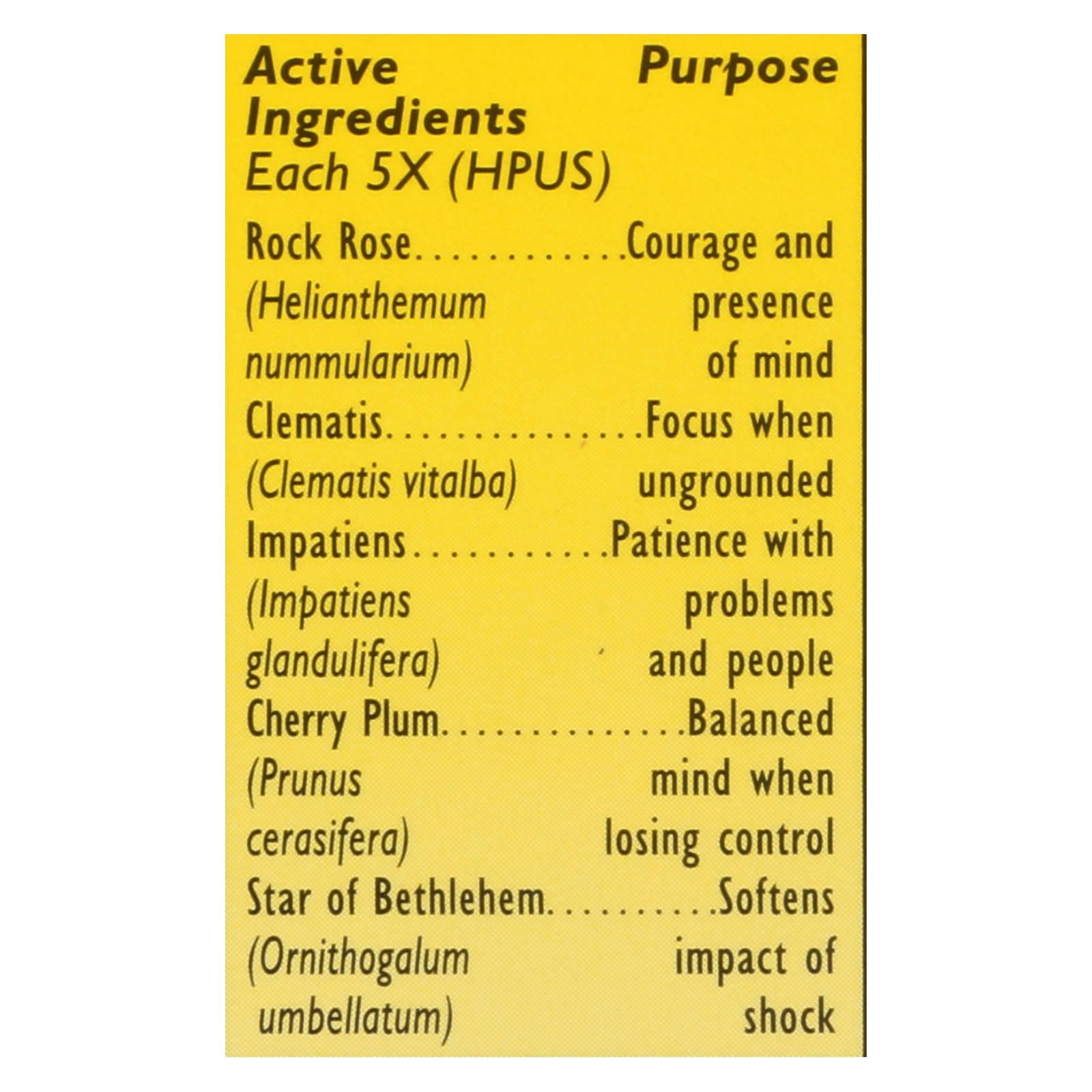 ingredients : active each 5x;hpus;rock rose;helianthemum nummularium;purpose courage and presence of mind clematis;clematis vitalba;purpose focus when ungrounded impatiens;impatiens glandulifera;purpose patience with problems and people cherry plum;prunus cerasifera;purpose balanced mind when losing control star of bethlehem;ornithogalum umbellatum;purpose softens impact of shock;inactive ingredient alcohol